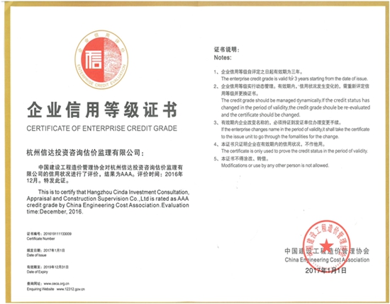 中國建設(shè)工程造價管理協(xié)會企業(yè)信用等級AAA級(2016.12 有效期三年)